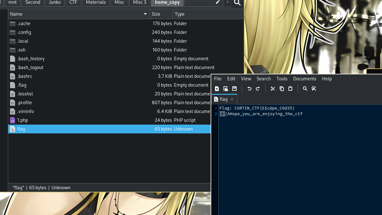 curtin@ip-172-31-19-125:~$ ls -lar total 56 -r-------- 1 curtin curtin 20 Oct 12 06:16 flag -rw-rw-r-- 1 curtin curtin 24 Oct 12 06:01 1.php -rw------- 1 curtin curtin 6563 Oct 12 05:51 .viminfo drwx------ 2 curtin curtin 4096 Oct 5 11:53 .ssh -rw-r--r-- 1 curtin curtin 807 Oct 5 11:47 .profile drwxrwxr-x 3 curtin curtin 4096 Oct 12 05:19 .local -rw------- 1 curtin curtin 20 Oct 12 05:58 .lesshst drwx------ 2 curtin curtin 4096 Oct 5 11:55 .cache -rw-r--r-- 1 curtin curtin 3769 Oct 12 05:35 .bashrc -rw-r--r-- 1 curtin curtin 220 Oct 5 11:47 .bash_logout -rw------- 1 curtin curtin 0 Oct 13 00:40 .bash_history -rw------- 1 curtin curtin 62 Oct 12 16:06 .Xauthority drwxr-xr-x 6 root root 4096 Oct 5 19:54 .. drwxr-x--- 5 curtin curtin 4096 Oct 13 00:40 .